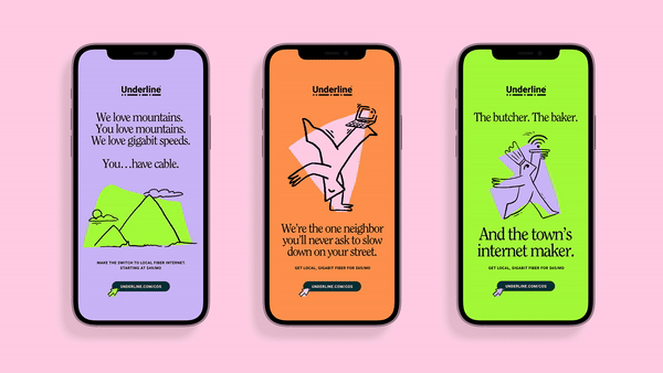 Underline arrived with the ambitious goal of ending the internet service provider monopolies that strangle small US cities. It was time to create a stronger connection. Inspired by the fully-local teams that were committed to this launch community, the refreshed Underline brand creates a sense of the familiar — like a charismatic member of your neighborhood who always looks out for everyone’s best interest. And always with a playful, infectious joy that you just can’t fake.